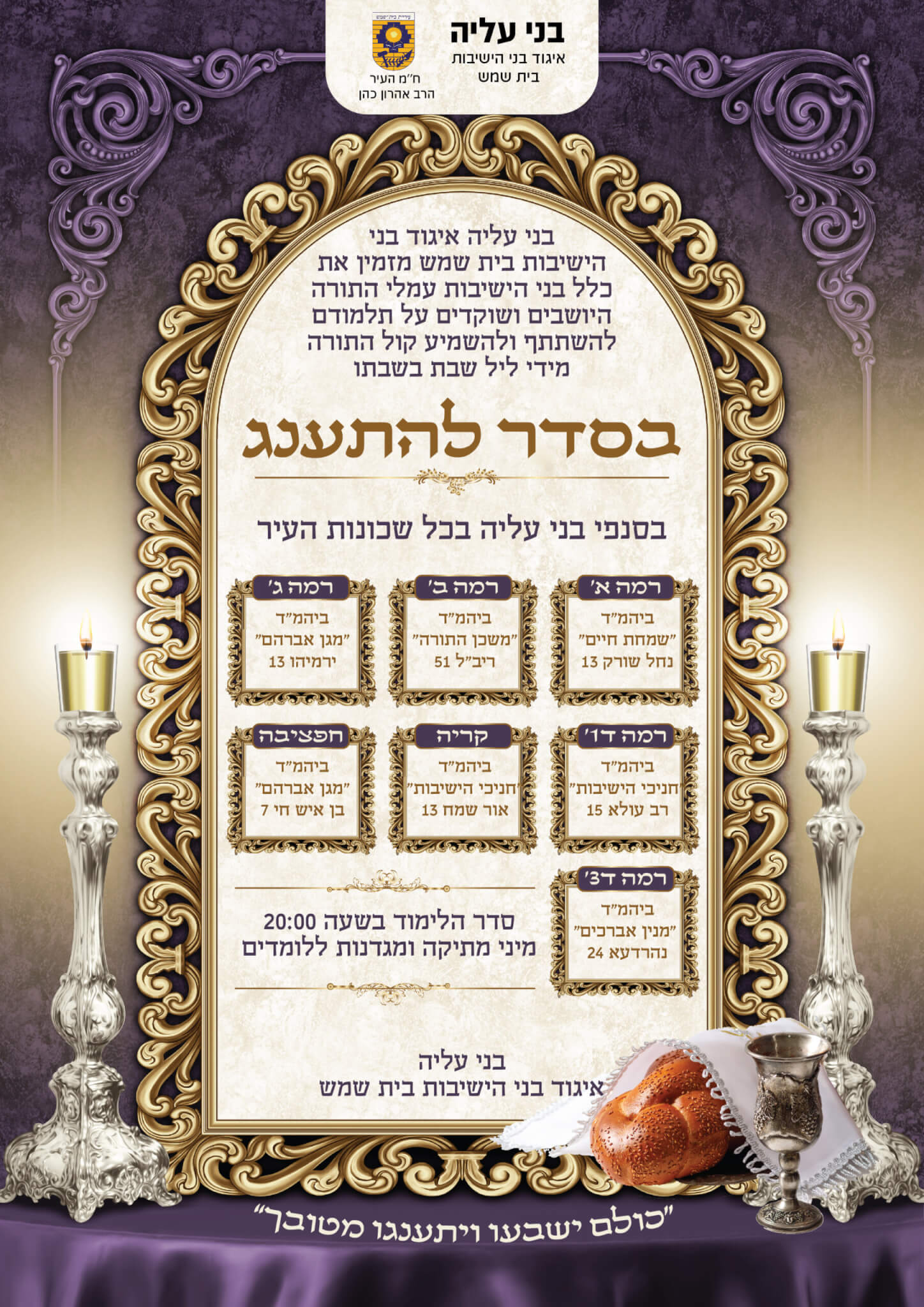 סדרי לימוד יתקיימו מדי שבת בשבתו בבתי המדרש המרכזיים בכל שכונה: 'שמחת חיים' (רמת בית שמש א'), 'משכן התורה' (רמת בית שמש ב'), 'מגן אברהם' (רמת בית שמש ג'), 'חניכי הישיבות – רב עולא' (רמת בית שמש ד'1), ו'מנין אברכים – נהרדעא' (רמת בית שמש ד'3), 'חניכי הישיבות' (בקריה החרדית). בשבתות חופשיות יתקיים סדר לימוד גם בביהמ"ד 'מזרח שמש' בחפציבה.