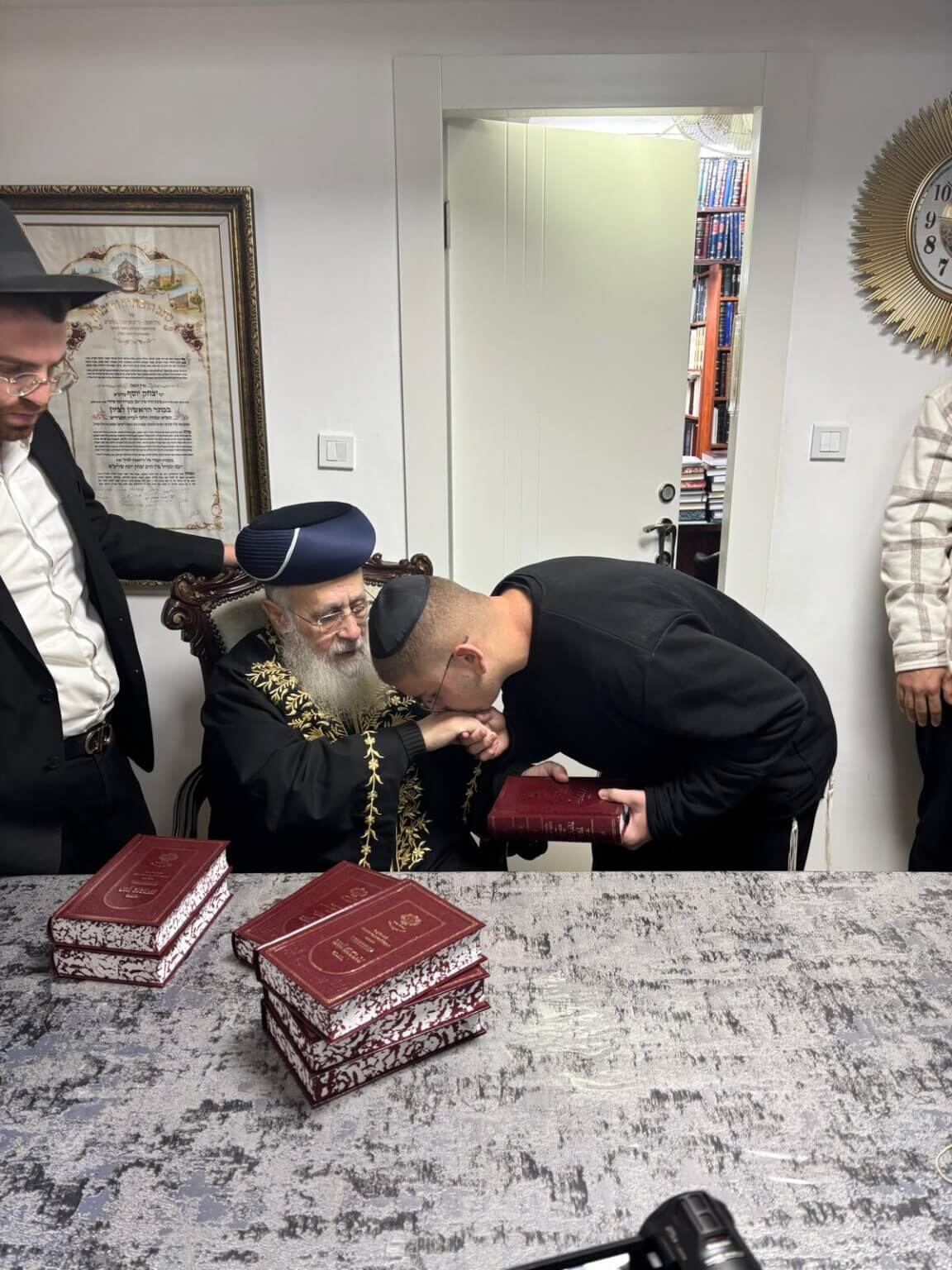 בסיום השיחה העניק מרן הראשון לציון שליט"א באופן אישי לכל המשתתפים את הסידור "חזון עובדיה" שבסופו הלכות מתוך ספר ילקוט יוסף הרואה אור בימים אלה.