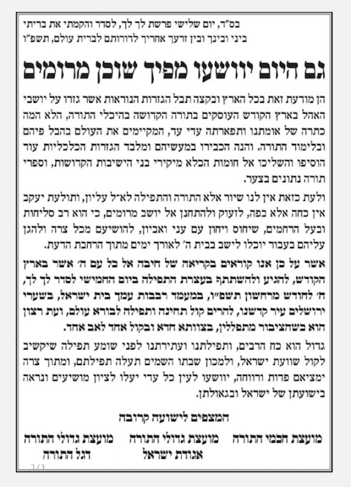 בעקבות הגזרות הקשות על עולם התורה ובני הישיבות ולקראת עצרת רבבות אלפי ישראל שתיערך מחר, חתמו יחד חברי מועצת חכמי התורה, חברי מועצת גדולי התורה של דגל התורה וחברי מועצת גדולי התורה של אגודת ישראל על מכתב חריף ונרגש, הקורא לציבור יראי ה' להתייצב בעצרת התפילה הגדולה שתתקיים ביום חמישי בירושלים.