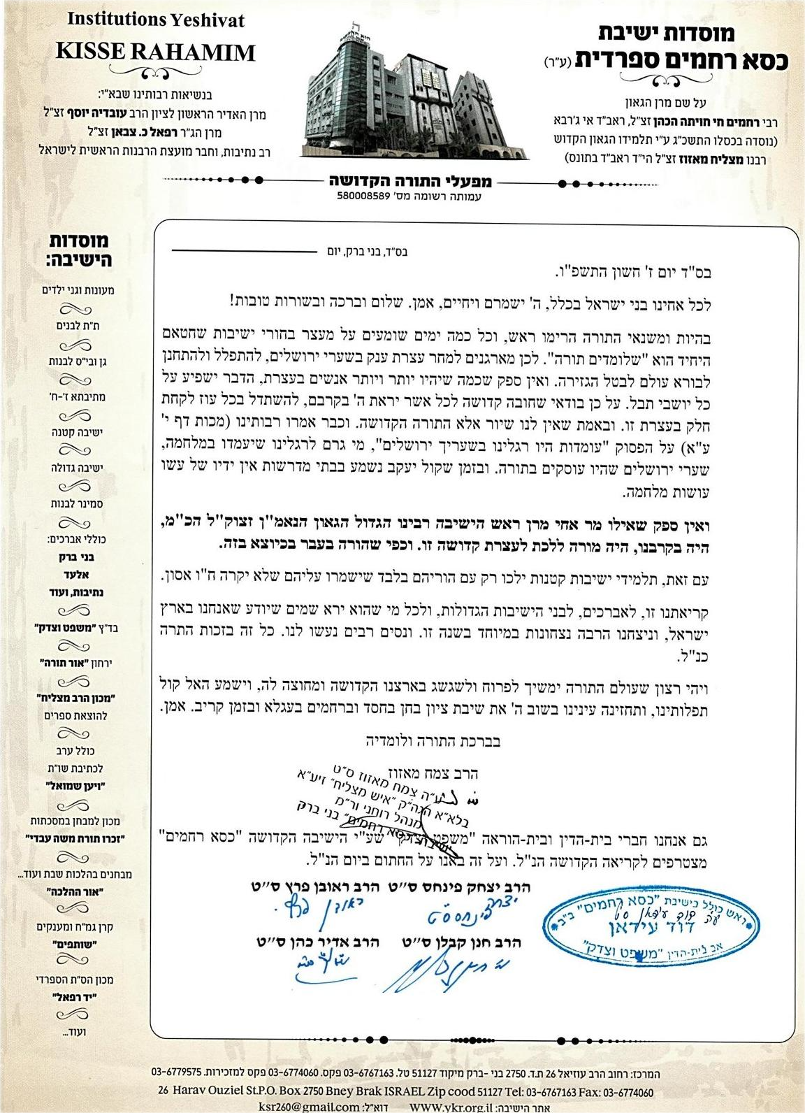 על מכתבו של ראש הישיבה הצטרפו גם חברי בית הדין "משפט וצדק" מיסודו של מרן ראש הישיבה הגר"מ מאזוז זצוק"ל, שכתבו: "גם אנחנו, חברי בית הדין ובית ההוראה 'משפט וצדק' שעל ידי הישיבה הקדושה כסא רחמים, מצטרפים לקריאה הקדושה הנ"ל. ועל זה באנו על החתום ביום הנ"ל." הרבנים הגאונים: הראב"ד רבי דוד עידאן, רבי יצחק פנחס, רבי ראובן פרץ, רבי חנן קבלן, ורבי אדיר כהן שליט"א.