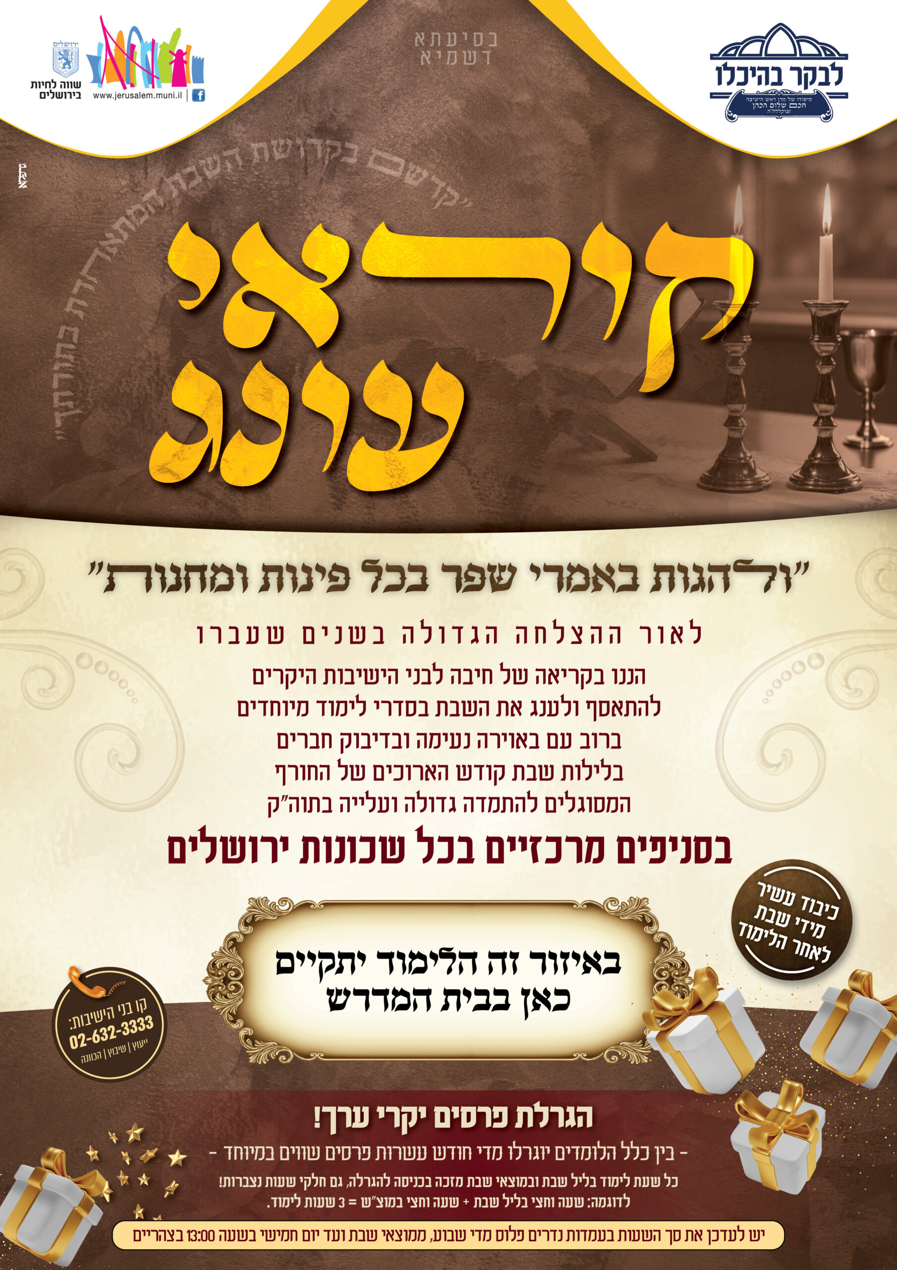 לפרטים נוספים ניתן לפנות לקו בני הישיבות: 02-632-3333.