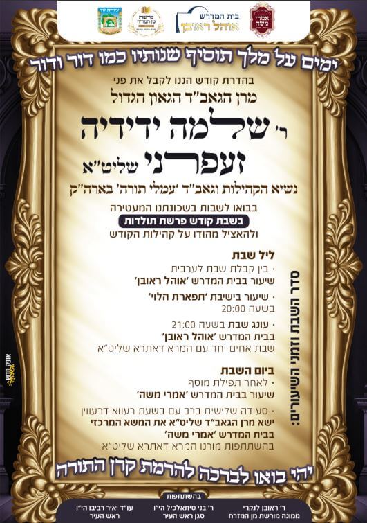 ביום השבת, לאחר תפילת מוסף, מסר מרן הגאב"ד שיעור בבית המדרש שע"י קהילת 'אמרי משה', בהשתתפות תושבים רבים, ובראשם המרא דאתרא שליט"א. בשעת רעווא דרעווין נערכה סעודה שלישית ברב עם, ושם נשא מרן הגאב"ד את המשא המרכזי — דברי התעוררות מחזקים ומרוממים.