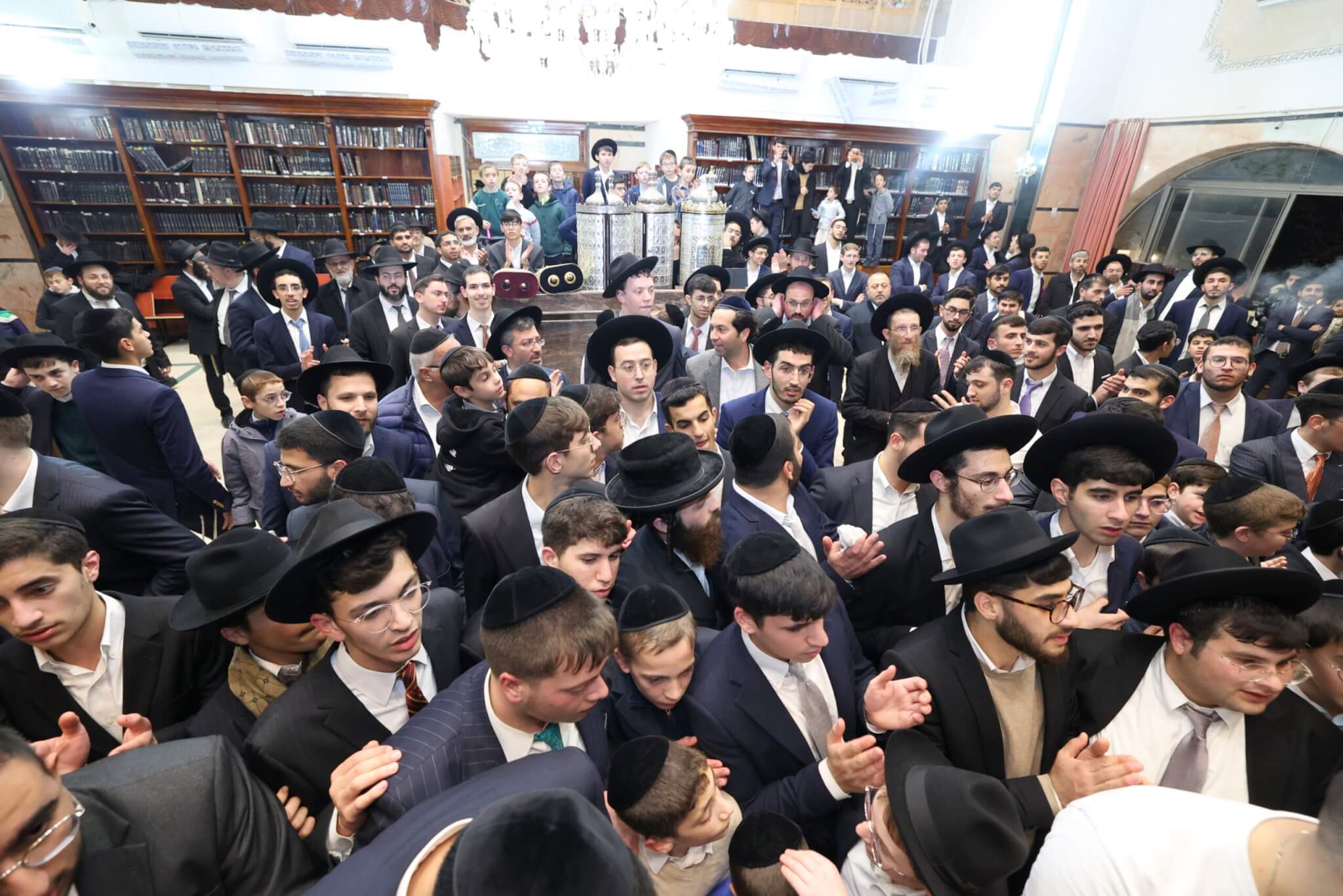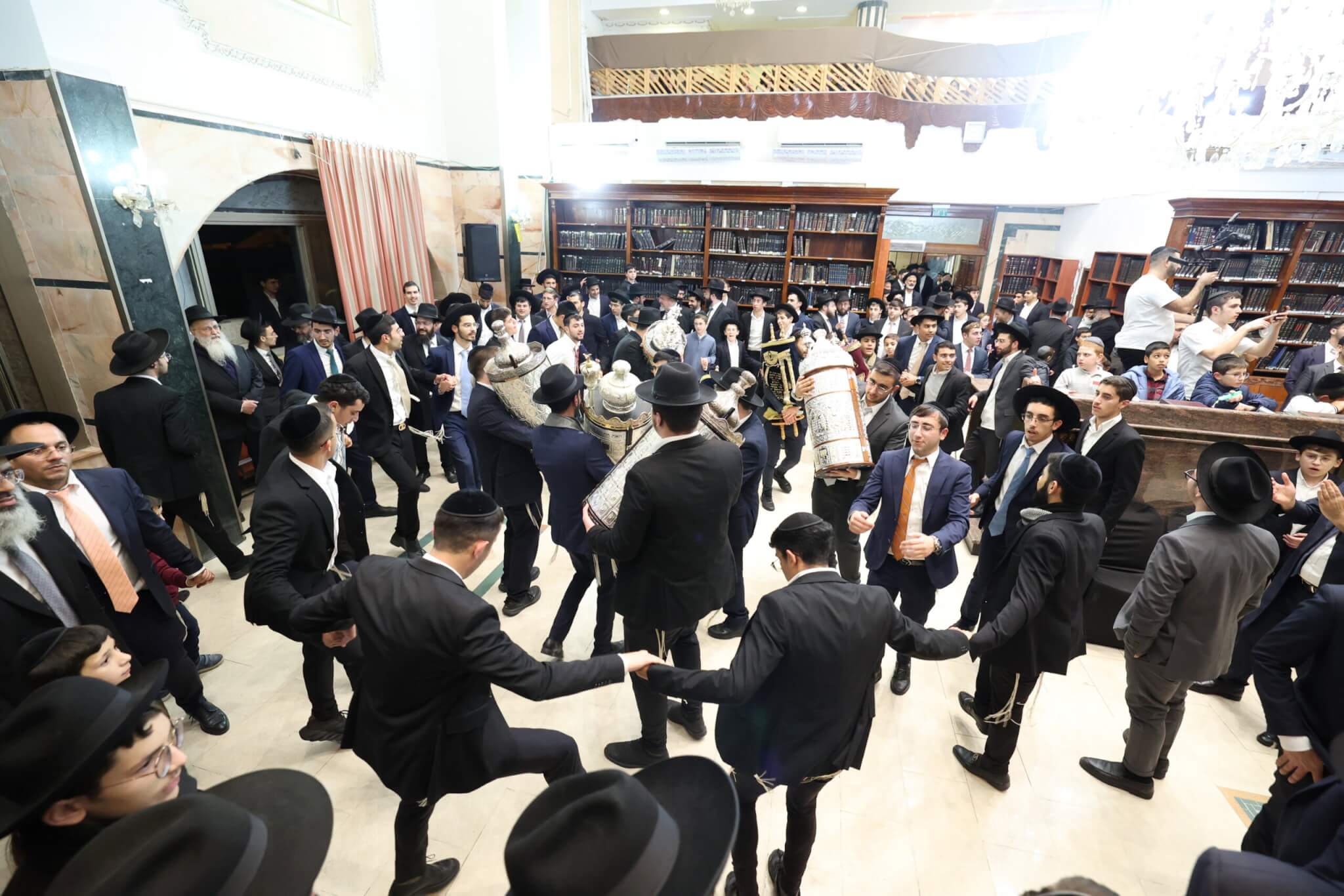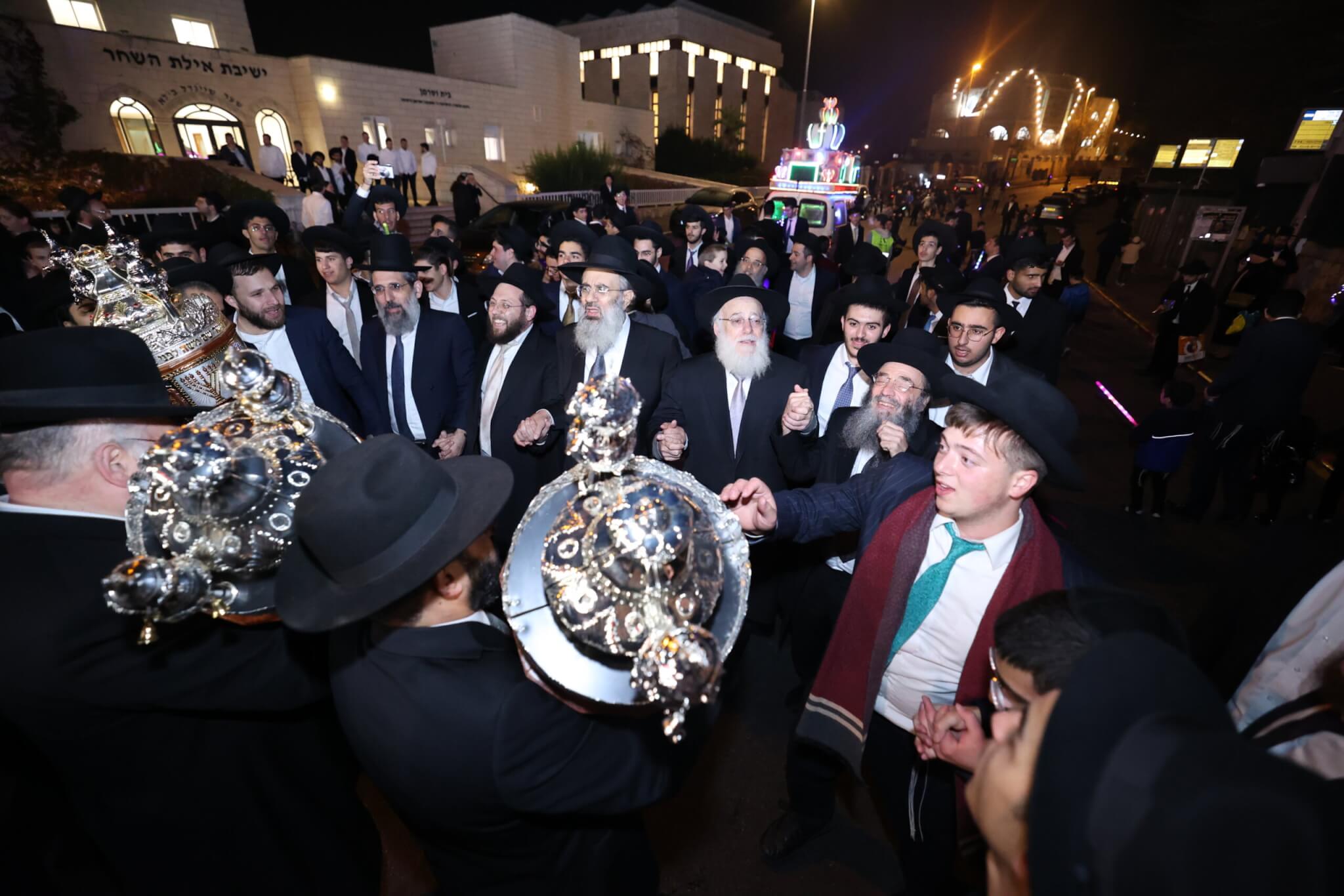 בכניסה להיכל הישיבה גאתה השמחה והתעצמה עד מאד. מקהילות השכונה ומישיבות סמוכות זרמו רבים להשתתף ברגעי הקודש, בעוד בני הישיבה מרקיעים בריקוד של שמחת תורה שאין דומה לו.