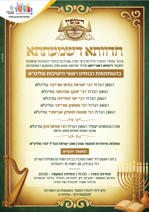 המעמד יתקיים בבית המדרש "מסילת ישרים" בשכונת רמות א' בעיה"ק ירושלים תובב"א. ציבור רחב של שוחרי תורה, תלמידי חכמים, מרביצי תורה, אברכים ובחורי ישיבות, צפוי ליטול חלק במעמד מיוחד זה, אשר יוקדש למו"מ ולהתנצחות במלחמתה של תורה בעומקא דשמעתתא, יחד עם ראשי הישיבות וגדולי הלמדנים שבדור.
