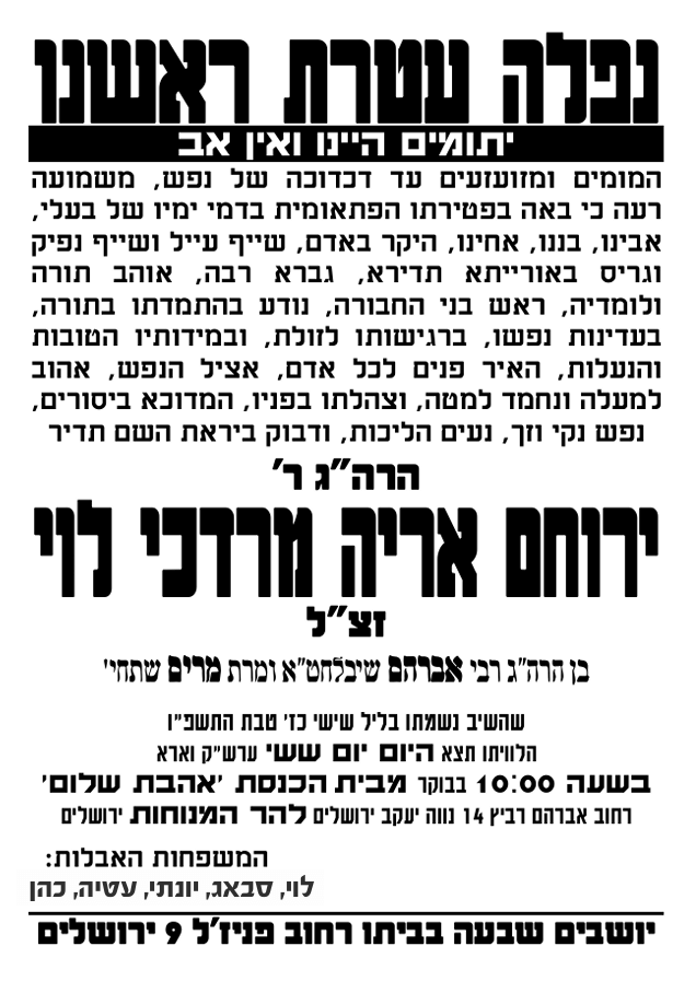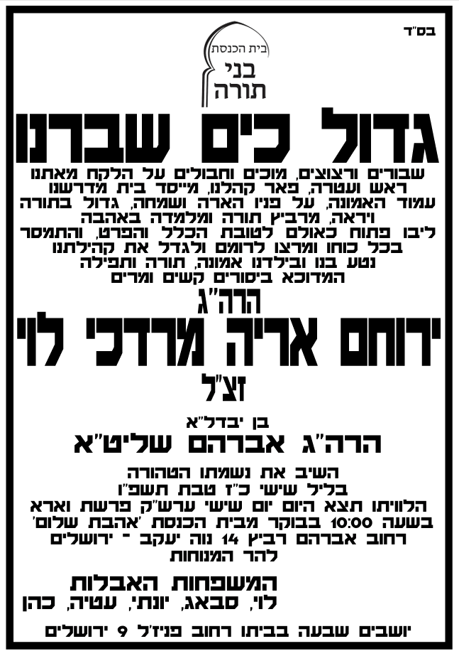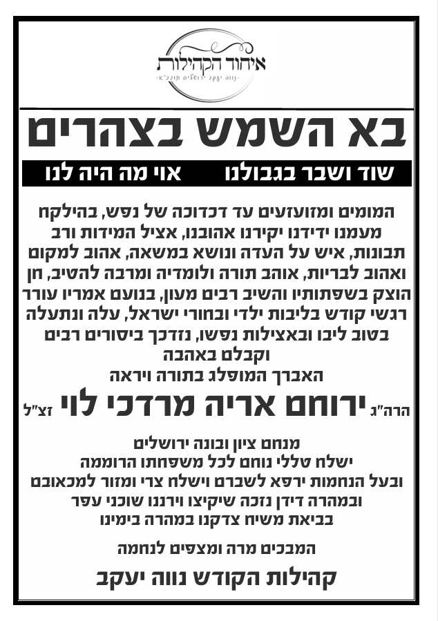 אבל כבד בקהילות האברכים בשכונת נווה יעקב עם היוודע הבשורה הקשה על הסתלקותו בטרם עת של האברך החשוב הרה"ג ירוחם אריה מרדכי לוי זצ”ל, אשר נסתלק לבית עולמו בליל שישי כ"ז טבת התשפ"ו.