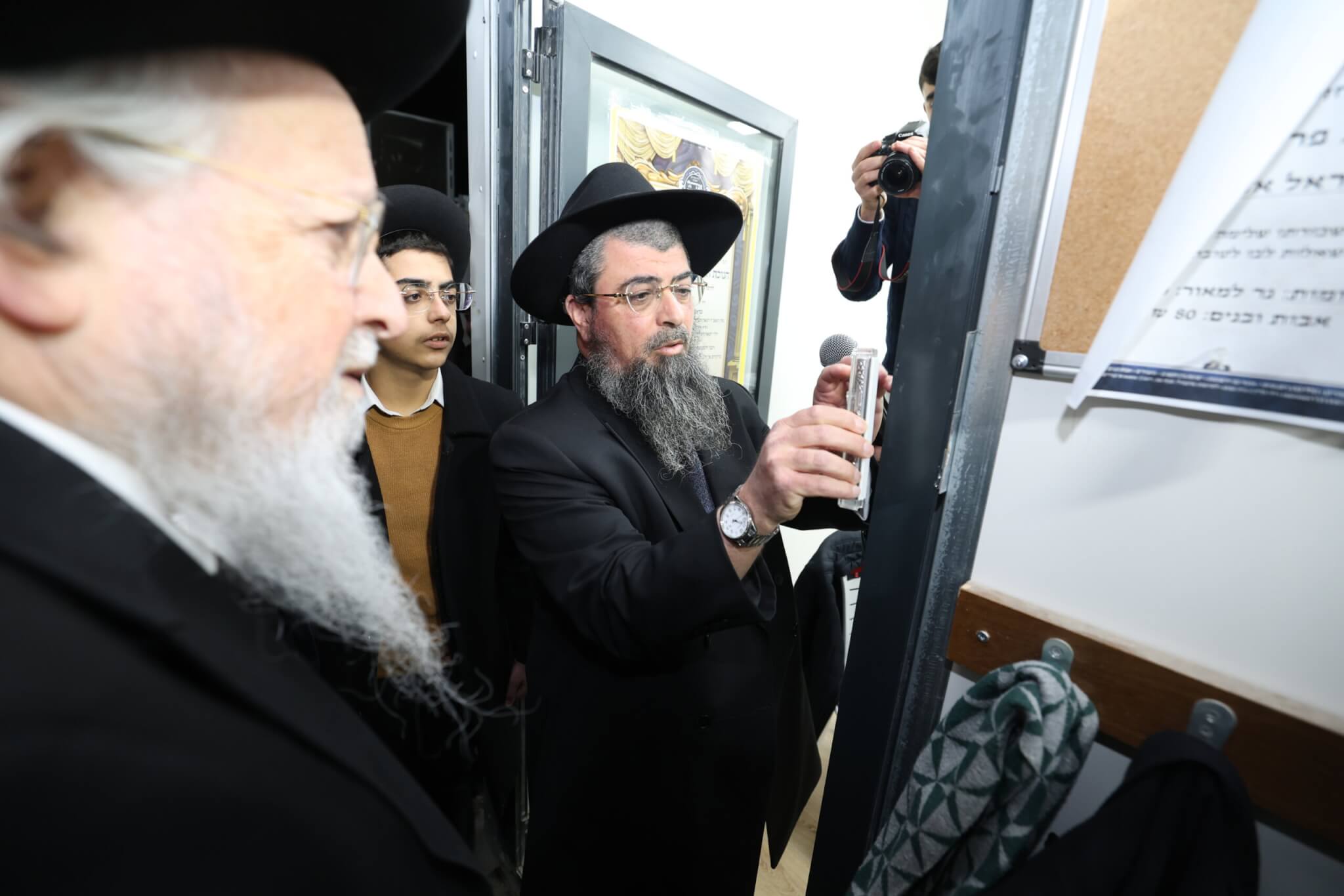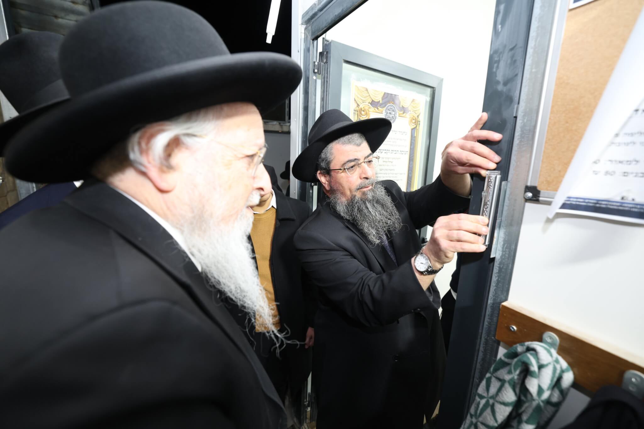 לאחמ"כ החל מעמד קביעת המזוזות ע"י מרנן ורבנן מרן הגאב"ד הגרש"י זעפראני שליט"א, רה"י הגר"מ תופיק אביעזרי שליט"א, הגר"י אמסלם שליט"א והגר"ב קדוש שליט"א. ובסיום המעמד פצחו מרנן ורבנן יחד עם בני הקהילה בריקודים וזמירות מתוך שמחה של מצווה לכבוד המעמד.