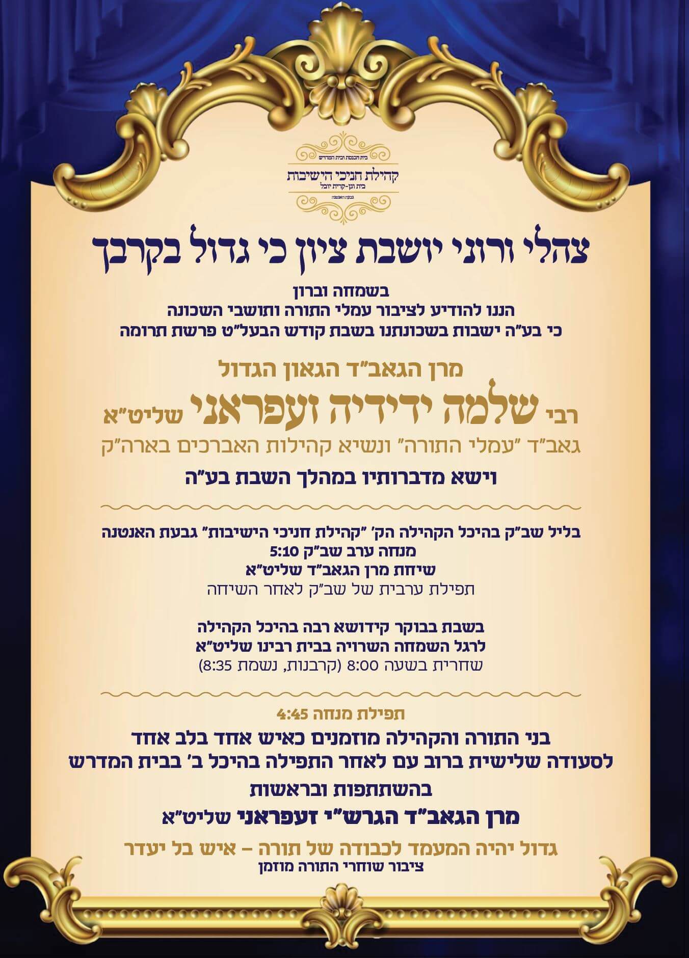 מרן הגאב"ד הגאון הגדול רבי שלמה ידידיה זעפראני שליט"א, נשיא קהילות האברכים וגאב"ד עמלי התורה, שבת בשכונת בית וגן בהיכל הקהילה החשובה "קהילת חניכי הישיבות" בגבעת האנטנה, ומסר שיעורים ושיחות ואף נערכה סעודה שלישית מרכזית ברוב עם. השבת נערכה לכבוד שמחת בר המצוה לנכדו, בנו של הרב יעקב ישראל זעפראני שליט"א, מראשי הקהילה.
