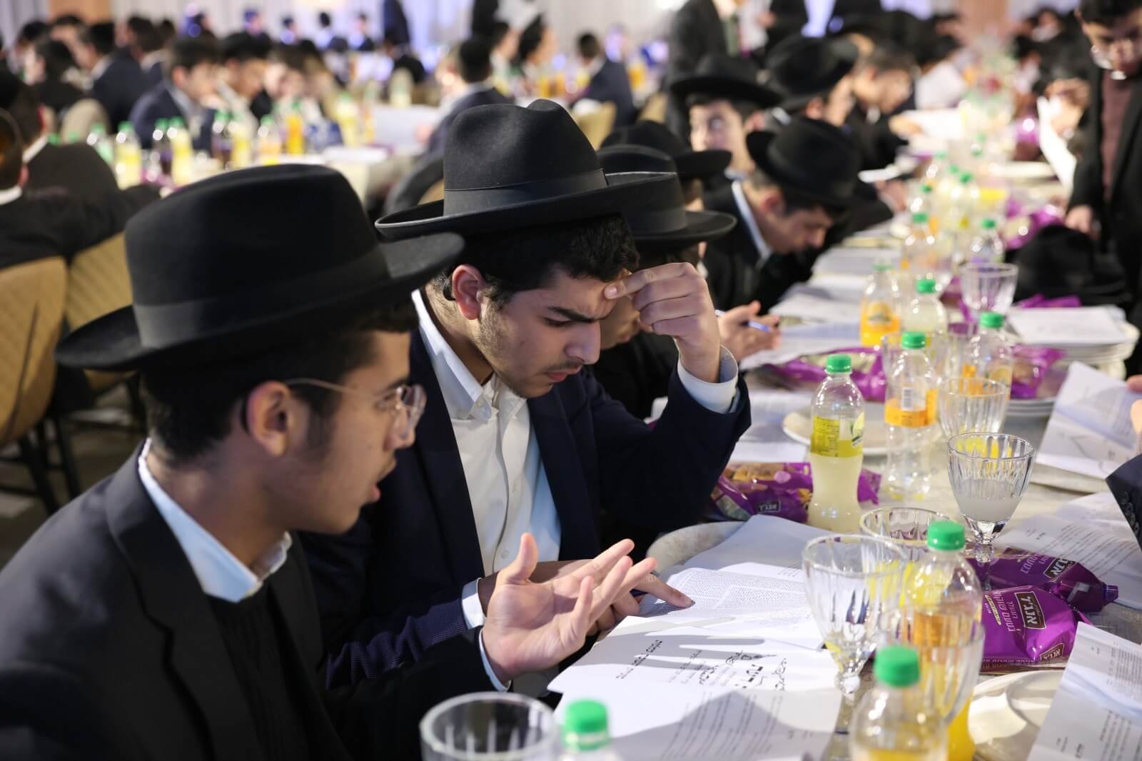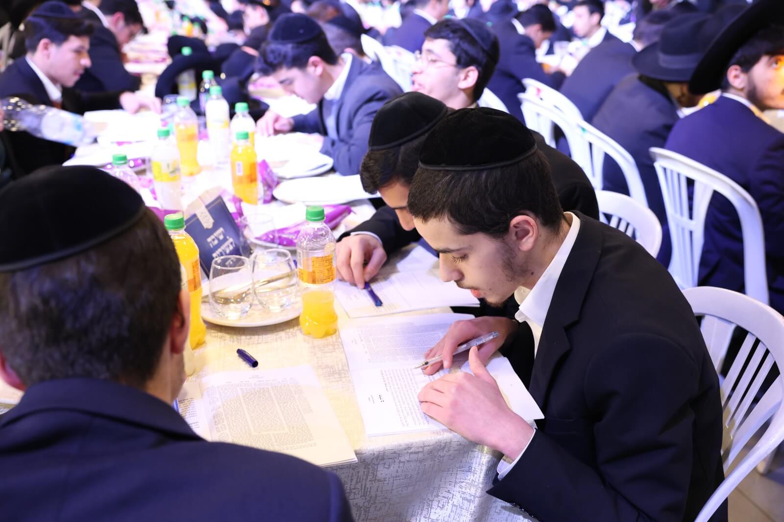 תחילה התכנסו בני הישיבות יחד עם רבותיהם ראשי הישיבות לסדר לימוד מעמיק בסוגיית "העוסק במצווה פטור מן המצווה". בפני הלומדים הונחה חוברת מיוחדת ובה מראי מקומות ומקום לרישום הערות וחידושים, ובמשך כשעתיים התמלא האולם בקול תורה אדיר, כאשר הבחורים מתפלפלים יחד בעיון ובהעמקה. המחזה עורר התרגשות רבה למראה אולם שמחות ההופך למוקד של שקידת התורה.