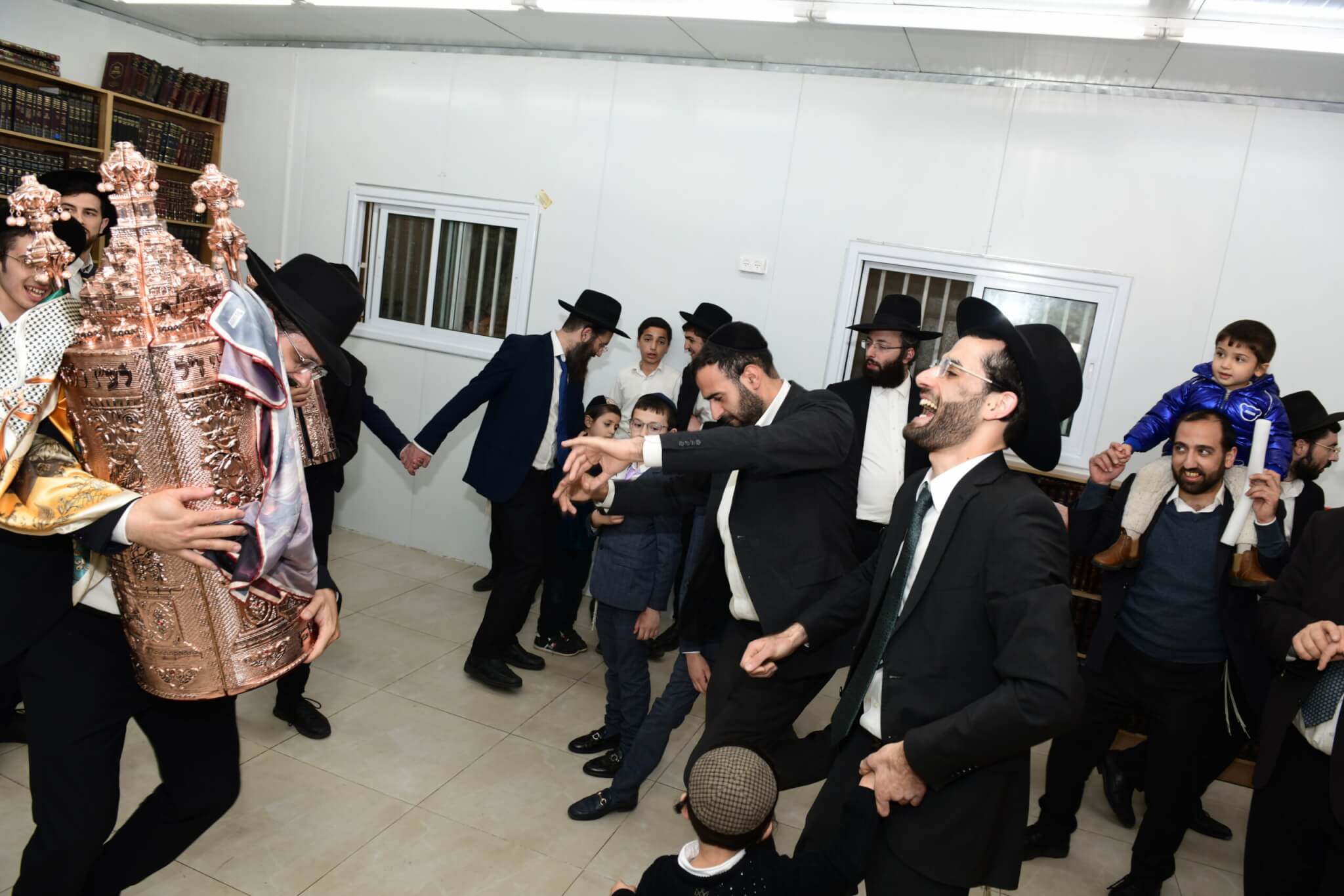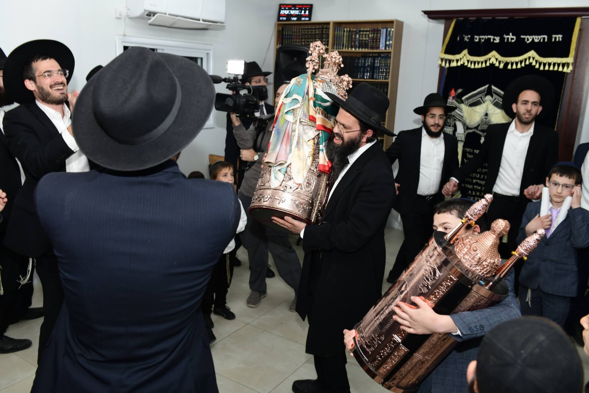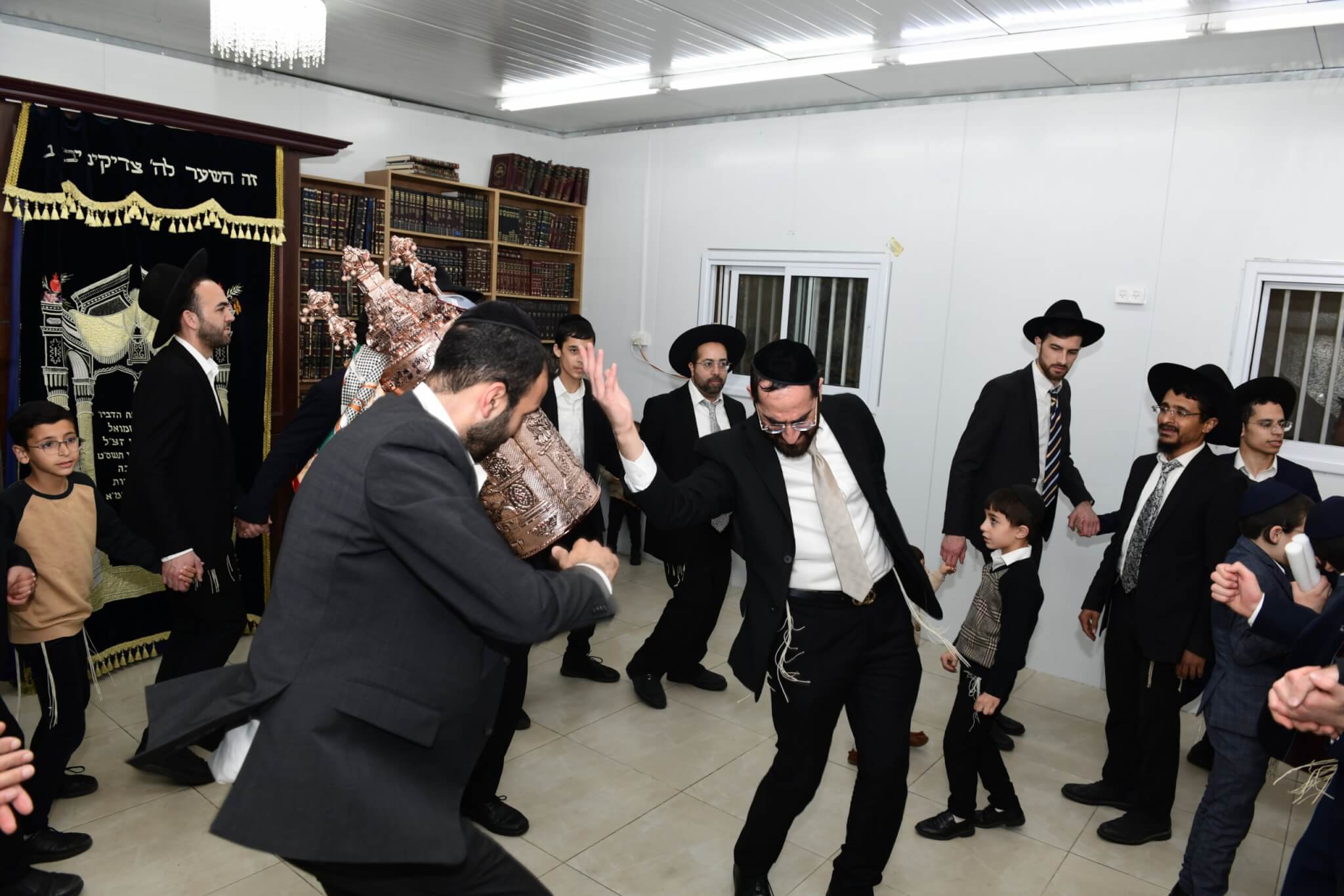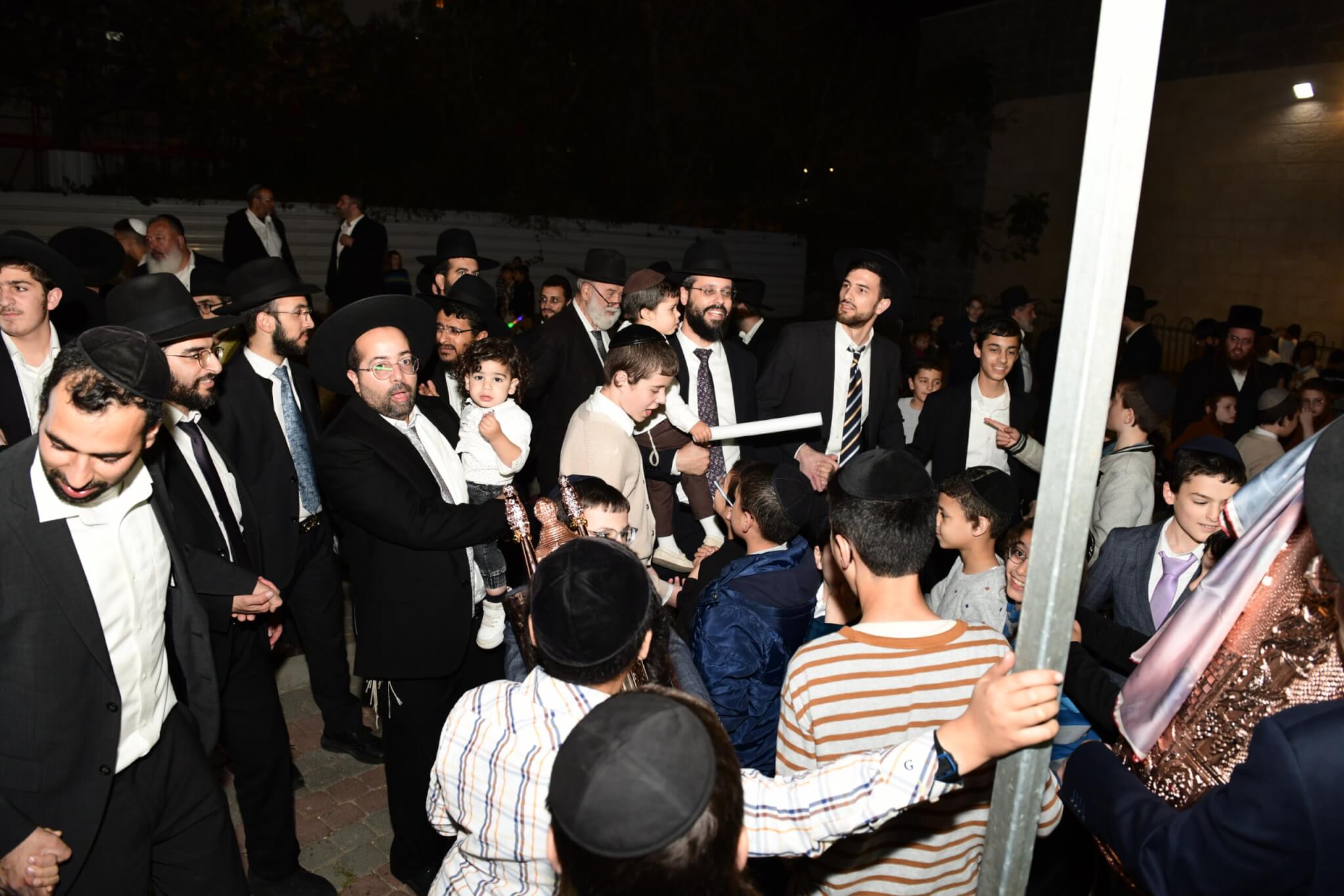 עם התקרבות התהלוכה לבית המדרש יצאו האברכים לקראת ספר התורה כשספרי התורה מארון הקודש בידיהם, מתוך התרגשות וכבוד התורה. בהמשך נמשכו הריקודים שעה ארוכה בהיכל בית המדרש, עד לרגע המרומם שבו הוכנס ספר התורה אל ארון הקודש.
