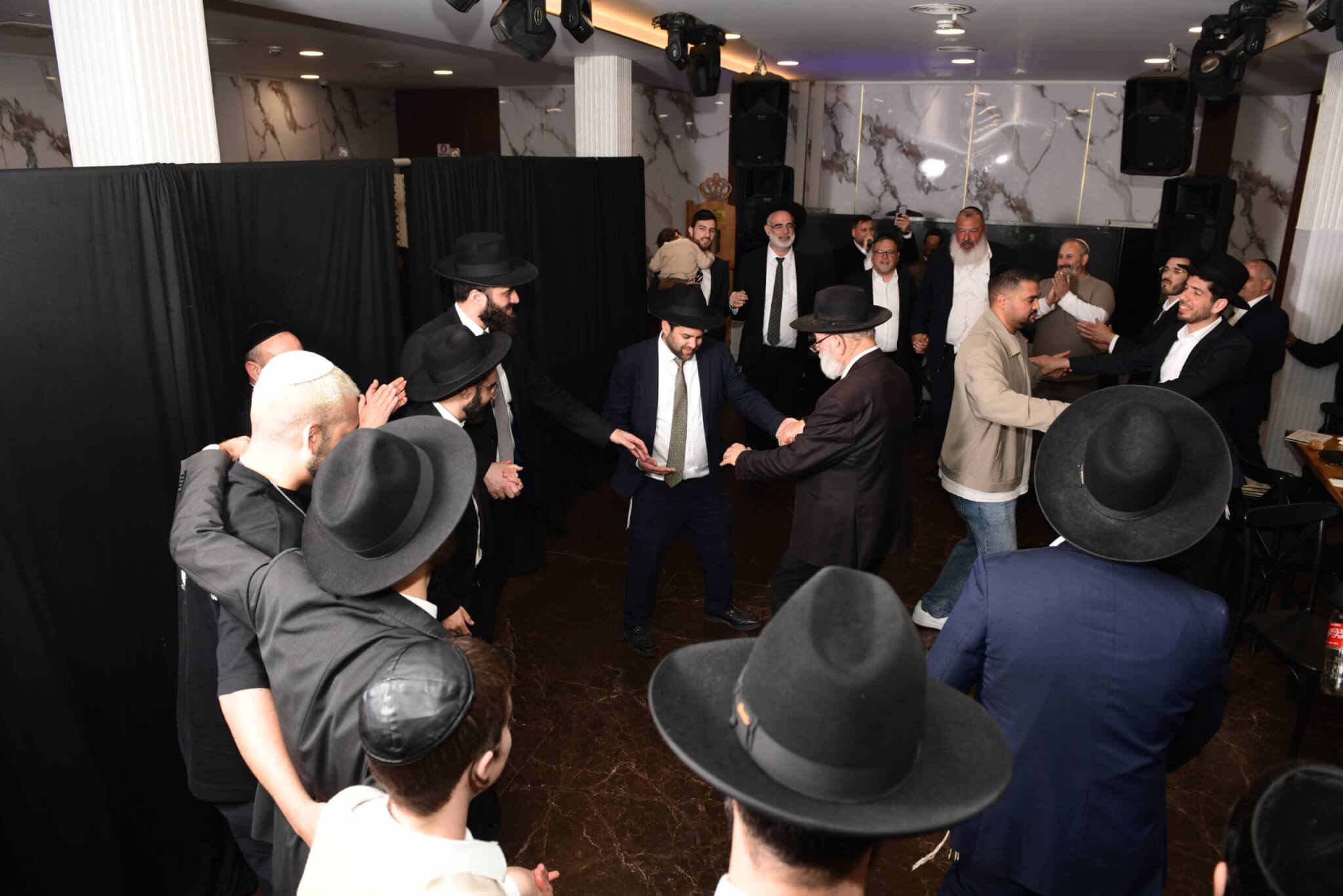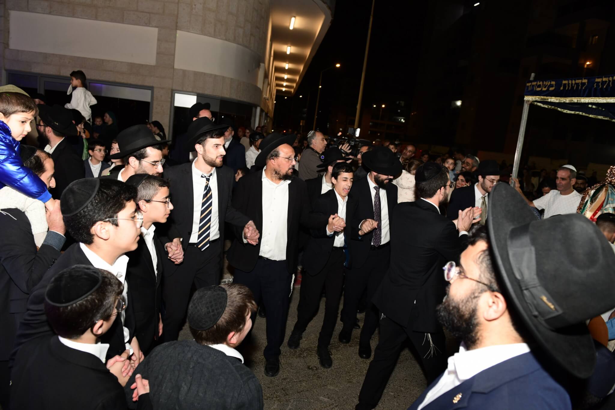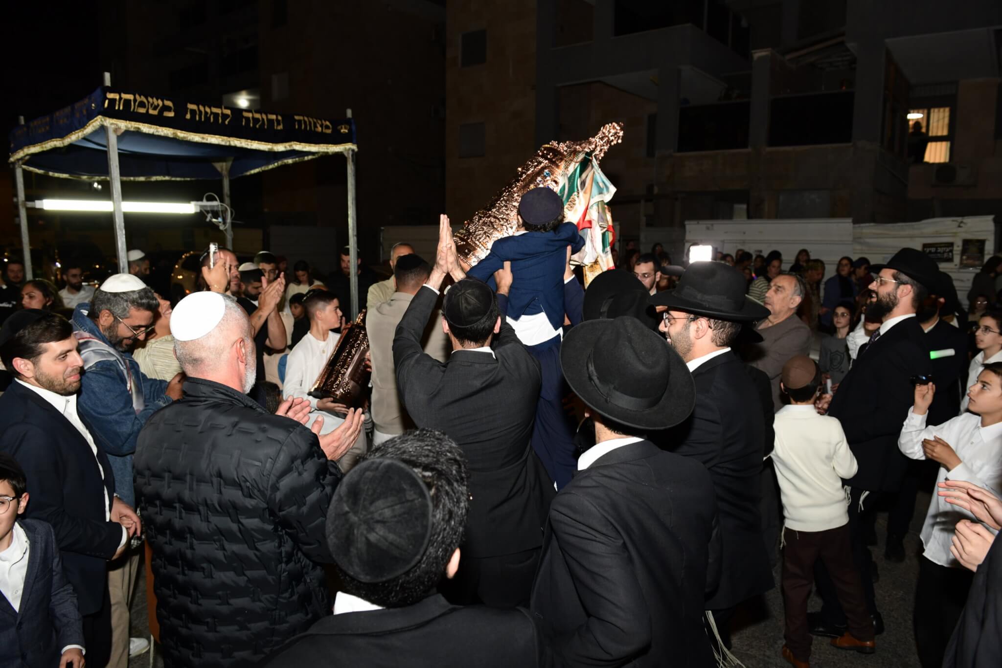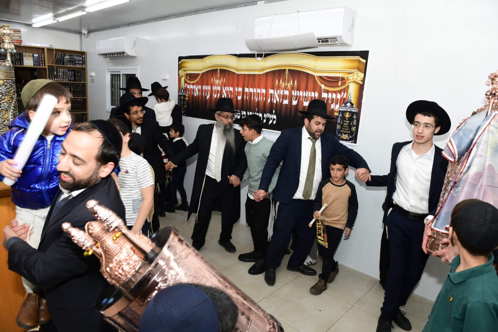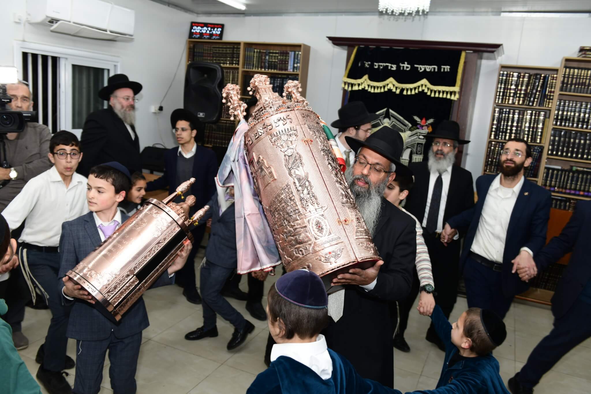 עם התקרבות התהלוכה לבית המדרש יצאו האברכים לקראת ספר התורה כשספרי התורה מארון הקודש בידיהם, מתוך התרגשות וכבוד התורה. בהמשך נמשכו הריקודים שעה ארוכה בהיכל בית המדרש, עד לרגע המרומם שבו הוכנס ספר התורה אל ארון הקודש.
