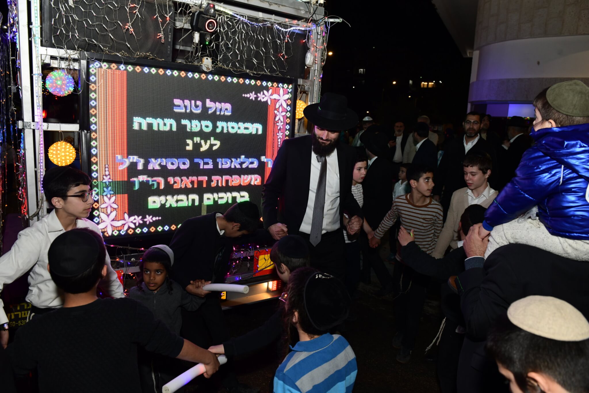 תחילת המעמד התקיימה בבית משפחת דואני, שם נערכה כתיבת האותיות האחרונות לספר התורה. לאחר מכן יצאה התהלוכה בשירה ובריקודים אל עבר בית המדרש, כאשר מאות מתושבי האזור מצטרפים לשמוח בשמחת התורה וללוות את הספר הקדוש בדרכו.