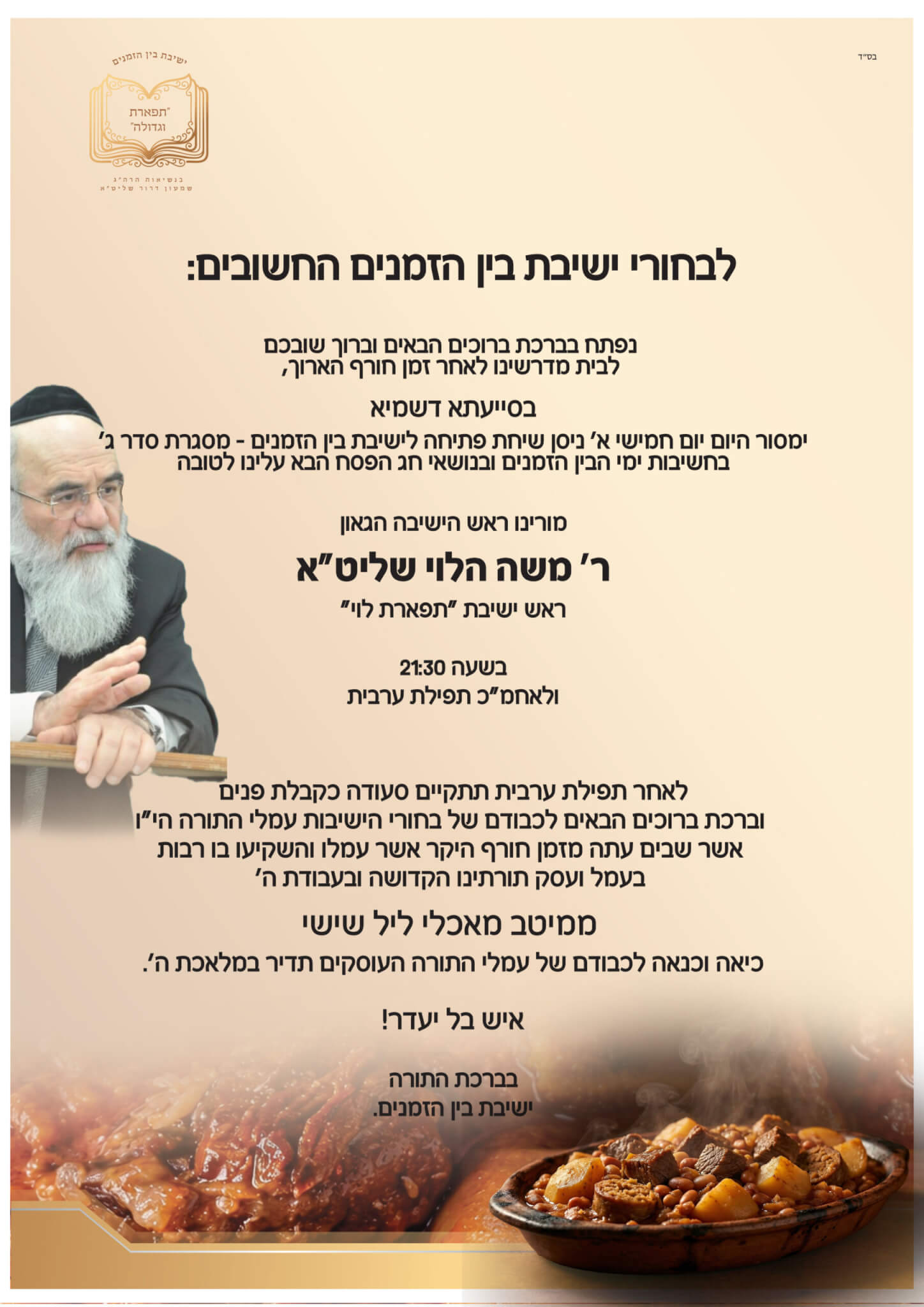 ביום חמישי, א' בניסן, מסר ראש ישיבת "תפארת לוי", הגאון הגדול רבי משה הלוי שליט"א, שיעור ושיחת פתיחה לבחורים. בשיעורו עסק בסוגיית "אי קניין דרבנן מהני לדאורייתא", והרחיב בפלפול ובעיון מתוך הערכה לרמת הלימוד של המשתתפים.